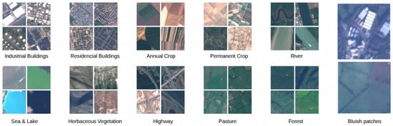 We now illustrate the notions and concepts of algorithmic bias that can be encountered in industrial applications on the RGB version of the EuroSAT dataset (https://madm.dfki.de/downloads, accessed on 30 October 2023) []. It contains 27000 remote sensing images of pixels with a ground sampling distance of 10 m. The RGB channels were also reconstructed based on the original 13-band Sentinel-2 satellite images. Each image has a label indicating the kind of land it covers, as shown in Figure 2 (left).