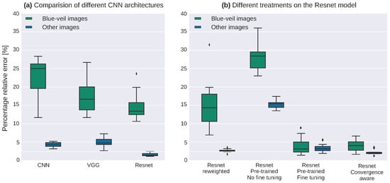 Box-plots of the average errors obtained on the test set with the EuroSat dataset using different models and different training strategies. For each strategy, the two boxplots distinguish the average errors on blue-veiled images (green boxplots) and other images (blue boxplots): (a) Baseline results obtained on different neural network architectures; (b) Effect of different treatments on the average accuracy of the Resnet architecture.