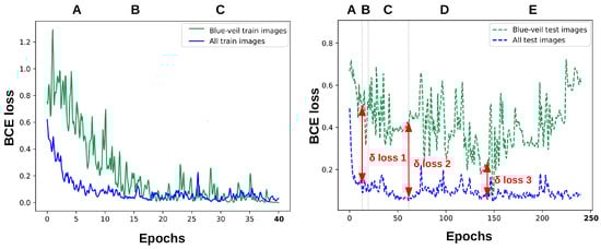 Detailed convergence of the BCE-loss on all data and on blue-veil images only. Results obtained on the training set (left) and on the test set (right) are represented. Note that the convergence curves obtained on the training set are only represented for the first 40 epochs, and those obtained on the test set are represented on 250 epochs. Five phases A to E are distinguished to discuss the convergence behaviour.