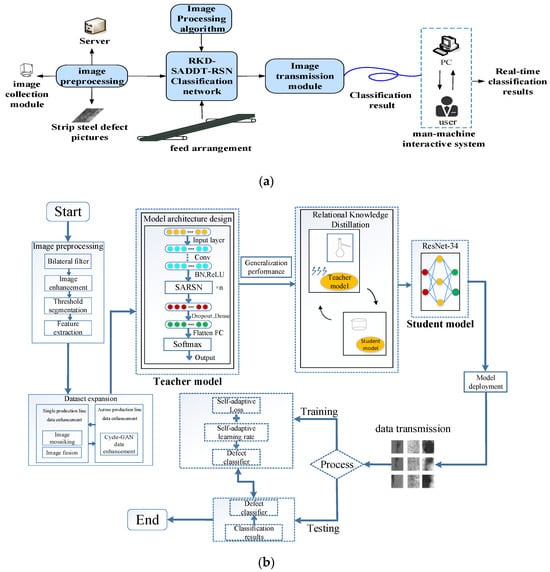 In the production process of strip steel, the applied classification algorithms should not only ensure its accuracy, but also meet the real-time requirements of the industrial field, which imposes high requirements for the model deployment process and the design of the classification algorithms. Figure 1a shows the deployment flowchart of the classification model for strip steel defects. In the preprocessing stage, first, the strip steel defect images are obtained. Through the processor, they are input into the classification network, and the defects are classified by related processing algorithms. The detection speed of the classification algorithms matches the running speed of the strip conveyor. Finally, the classification results are input into the human–computer interaction system for users to operate. As shown in Figure 1b, the strip defect classification algorithm is designed for this paper, and the strip steel defect image is first preprocessed. To ensure sufficient data, image mosaicing and fusion and data enhancement based on Cycle GAN are carried out. Second, a deep network model is designed: a self-adaptive residual shrinkage network (SARSN) and the self-adaptive directional derivative threshold (SADDT) module constitute the core of the network. Then, a dropout layer, a dense layer and a fully connected layer are added. Next, the results are input into the softmax classifier. The network is used as the teacher model in relational knowledge distillation, and the student model is deployed in the front end with the lightweight network ResNet34 to learn the generalization ability of the teacher model. Finally, the student model is trained and tested.