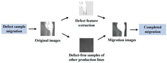 The basis of defect sample data migration comes from the similarity of the underlying features of different images, including lines, colors, textures, and other features. The CNN can thoroughly learn these image underlying features in source domain A and migrate them to target domain B. A schematic diagram of defect sample migration algorithms is shown in Figure 2.
