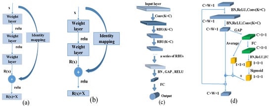 Schematic diagram of the residual learning unit. (a) Building block, (b) bottleneck, (c) architecture of a Res Net, and (d) architecture of RSBU.