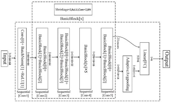 Figure 5 shows that this paper adds an attention mechanism branch after two BNs, two ReLUs, and two convolution layers, which can automatically infer a suitable parameter, namely the self-adaptive directional derivative (SADDT), and the function of the soft threshold function is replaced by the SADDT. Parallel branches can make the neural network direct more attention to details effectively, and finally import into the backbone output of the neural network is ultimately imported through the feed-forward channel. A schematic diagram of the SARSN backbone network is shown in Figure 6.