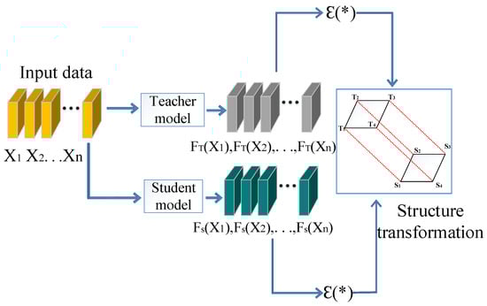 where and are distillation losses to penalize the difference between the teacher model and the student model. and represent two model functions, and is an n-tuple array collection of multiple sets of data, i.e., . is the potential energy function, which is used to calculate the potential energy relationship between n-tuple arrays, and is the core part of the function. The teacher model transfers data to the student model through the potential energy to complete the knowledge transfer.