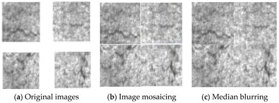 According to the analysis of Figure 8b, we can see that the stitching generated the same type of defect samples. After median fuzzy processing, the stitching gap in Figure 8c has been completely eliminated, and the image can be used as a new sample after resizing.