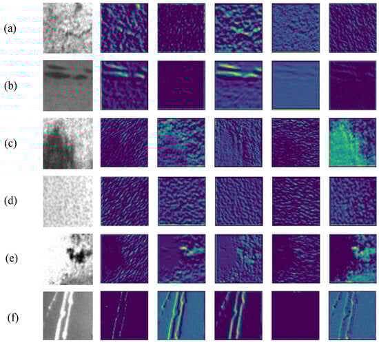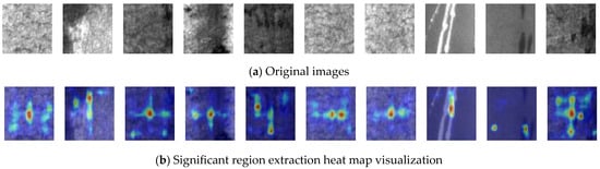 In addition, in order to accurately locate the salient region of the defect being focused on by the neural network, we visualize the feature extraction results of the SARSN network by heat map, as shown in the results. Figure 19a is the original input image, and Figure 19b is the visualization result of the salient region, in which the dark color represents the area of focus of the neural network. From the results in the graph, it can be seen that the classification network can capture the distribution of some defects, indicating that our method can accurately identify the defect location through feature extraction.