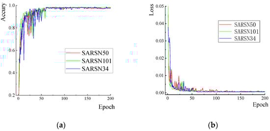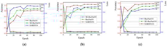 SE-ResNet calibrates the feature response in the channel direction by stacking the squeezing and actuating blocks together. While combining the self-adaptive directional derivative threshold with the channel attention mechanism, SARSN can learn more useful fine-grained feature information in a specific threshold range. As shown in Figure 15, we selected ResNet34, 50, and 101, SE-ResNet34, 50, and 101 and SARSN34, 50, and 101, respectively. The training and testing conditions remain the same.