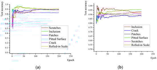 The experiment was carried out in this paper based on the NEU-DEU datasets. The image format of the dataset was adjusted to 64 × 64 RGB images, including 1600 images of various defects, namely: inclusion (In), crack (Cr), patches (Pa), pitted surface (Ps), rolled-in scale (Rs) and scratches (Sc). For all kinds of random samples, 1400 pieces were selected as training sets and 600 pieces were selected as testing sets. The label adopts the binary unique heat coding format. In this paper, the experiment was carried out under the Ubuntu system environment. The GPU model was an NVIDIA GTX 1080TI, and the PyTorch deep learning framework was used.