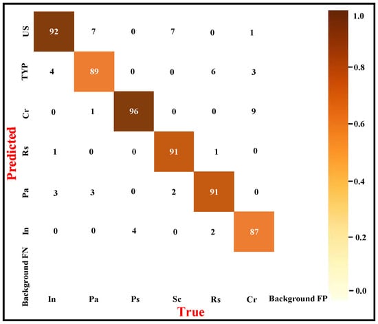 To further evaluate the testing effect of the student model obtained by distillation of relational knowledge, experiments were conducted on the 600 testing sets of strip steel defects. Each class contains 100 images, and the confusion matrix is shown in Figure 14, in which the abscissa represents the predicted value of each class of strip steel defect data, and the ordinate represents the true value. The classification accuracy P, the recall rate R, , and formulas of P, R and F1 are shown in Formula (21):