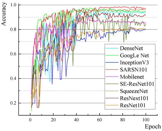 To verify the classification performance of different network models for strip steel defects, this paper uses GoogLeNet, DenseNet, InceptionV3, SqueezeNet, MobileNet, ResNet101, ResNext101, SE-ResNet101, and Teacher-SARSN101 Student-ResNet34 networks for comparative experiments. The test accuracy curve of each model is shown in Figure 16. Moreover, the classification accuracy, parameters and single image classification algorithm time consumption of each network model are shown in Table 6.
