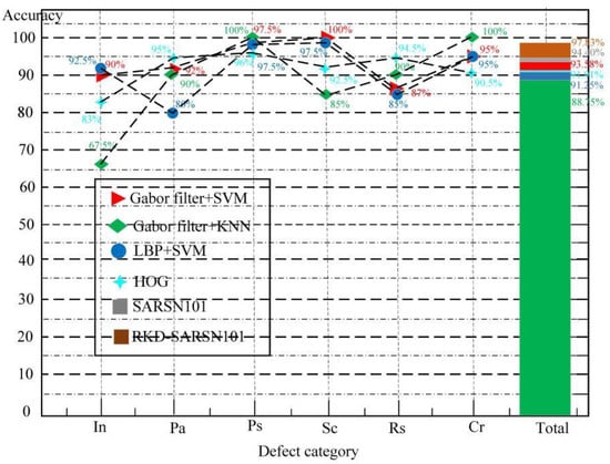 From the classification results, it can be seen that the four kinds of algorithms have their own advantages in dealing with the classification effect of a single defect, among which, Gabor filter+SVM and Gabor filter+KNN methods achieve 100% classification accuracy for Sc, Ps and Cr, because the fine-grained texture features of Cr and Ps defects with different scales are obvious. However, in the overall classification accuracy of the six types of defects, the classification effect of SARSN101 and RKD-SARSN101 proposed in this paper is better.