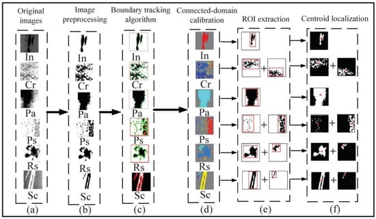 Image processing flow. (a) Original images. (b) Image preprocessing. (c) Boundary tracking algorithm. (d) Connected-domain calibration. (e) ROI extraction. (f) Centroid localization.