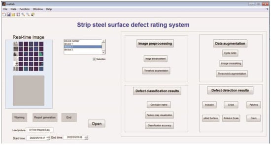 To effectively integrate the functions of each module of this algorithm and facilitate users in completing the task of defect classification without knowledge of the underlying algorithm, we developed a set of strip steel surface defect rating systems for front-end deployment, with the interface information shown in Figure 20. The functions of this system include query data enhancement results, classification results, target detection results, and image processing results. Moreover, intermediate processes such as feature map visualization results and confusion matrices can be derived. The deployment of equipment, monitoring platforms, and local area networks needs to be determined according to the actual situation of the industrial site. In addition, the neural network training and testing processes of this system are all carried out offline, and the results are uploaded through the local area network.