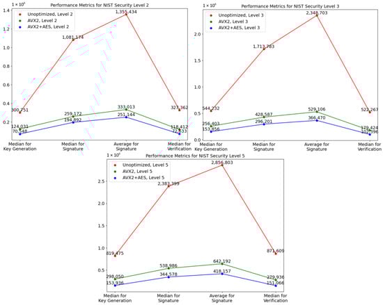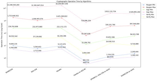 Figure 4 shows the algorithm’s performance metrics (minimum and maximum values) when run on a 3.1 GHz Intel Xeon E3-1220 CPU (Haswell architecture), with 32 GB of memory. Optimized implementations for platforms compatible with the AVX2 instruction set are also available. Specifically, for Haraka, the availability of the AES-NI instruction set is particularly noteworthy. Each of six implementations has its version for: