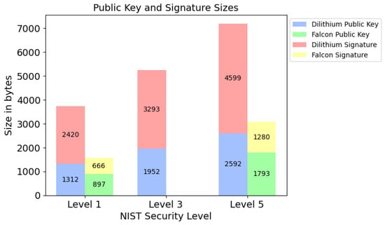 Figure 3. Key and signature size for Falcon and some competing algorithms []. - The modular design; for instance, NTRU lattices could be replaced with other lattice types.