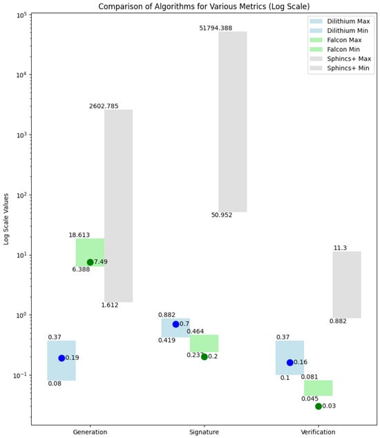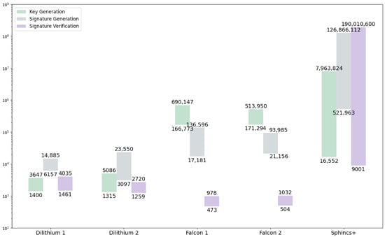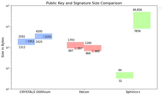 Two relevant parameters are compared in the analysis of algorithms: key size and signature size, for which smaller values are better. The data on key length and signature length are presented in Figure 5 [,,]. They are similar to the data reported for Dilithium and Falcon in [].