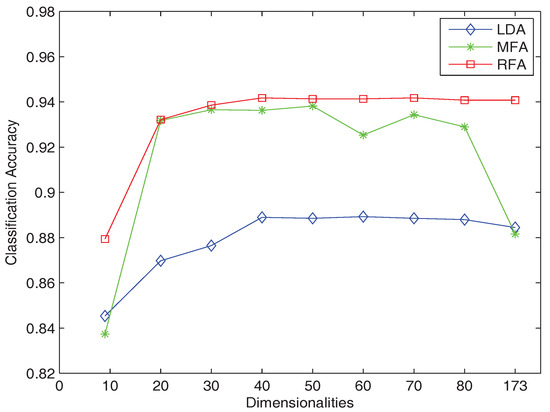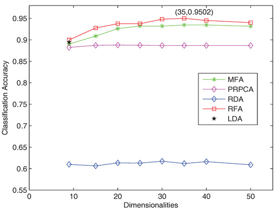 We followed MFA to construct the intrinsic and penalty graphs [14]. The numbers of nearest neighbors for constructing the intrinsic graph () and the penalty graph () were set to 5 and 20, respectively, for all the datasets.
