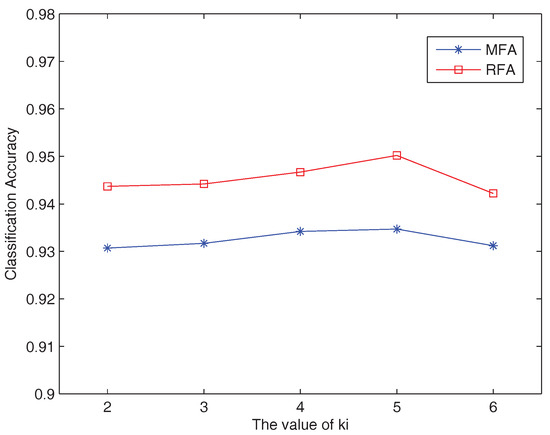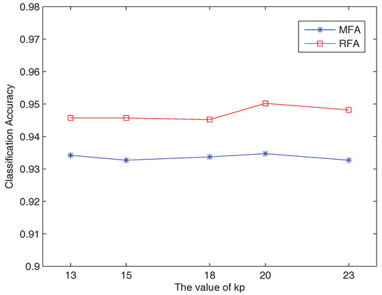 As shown in Table 11, the proposed KRFA obtained a comparable and even better result than KMFA. Furthermore, experimental results of KRFA were all better than RFA on the used datasets. That superiority can be especially reflected on the Satimage dataset. The performance of RFA on Satimage was unsatisfactory. However, KRFA conducted effective nonlinear dimensionality reduction and thus obtained good result on the following classification problem. These two points clearly demonstrate the nonlinear dimensionality reduction ability of KRFA.