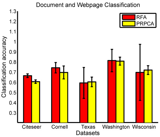 For this experiment, we used two datasets, citeseer and WebKB (https://linqs-data.soe.ucsc.edu/public/lbc/, accessed on 19 October 2023). We note that the WebKB dataset contains four subsets: Cornell, Texas, Washington and Wisconsin, and we show the experimental results of these four subsets separately. Each dataset contains bag-of-words representation of documents or webpages and citation links between the instances. Citeseer contains 3312 scientific documents from 6 different classes, and there are 4732 citation relation between the documents. WebKB consists of 877 webpages from 5 different classes, and there are 1608 page links within this dataset. We adopted the same strategy as in PRPCA to construct the relational matrix: