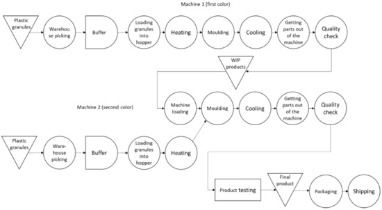 Figure 1 illustrates the production flow schema for fins, which employs two specific IMMs (labeled machines 1 and 2). The first IMM is designated as the base product, which is a paddle, whereas the second IMM is responsible for the colored booties. Plastic granules are loaded into the hopper of the first IMM. Afterward, the plastic material is heated and injected into the mold cavity. The molded product and paddles are cooled using water and the duration of the cooling phase is configurable during the configuration phase. The cycle time for a single puddle is 70 s. Once the paddles are manufactured, the bootie rubber is overprinted by inserting the previously molded base parts of the fins into the molds, which are subsequently placed into the machine. The heated colored plastic is then molded to fill the mold cavities, and the cycle time per fin pair is 160 s. The fins are cooled, inspected for quality, tested, and stored before packaging and shipment.