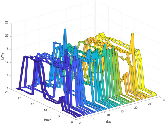Figure 2 presents a set of 30 profiles related to the hourly energy consumption in kWh for machine 1 over 24 h. The vertical axis indicates energy consumption in kWh. Energy consumption in the dataset ranged from a minimum value close to zero to a maximum value of approximately 20 kWh. The graph indicates that during the first 5 h, the energy consumption was relatively low. From hour 6, during the first working shift of the day, the energy consumption increased to a peak and remained high during the subsequent 16 h. However, it should be noted that this pattern is not invariant because the energy consumption profile may exhibit different patterns that depend mainly on the production schedule and process parameters.