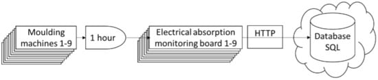 In this study, we obtained real data from the plastic industry, including the manufacture of scuba gear, freediving equipment, snorkeling devices, spearfishing equipment, and swimming accessories. The plastic components and products were fabricated using IMMs and utilized for the final product assembly. We considered nine IMMs that operate solely on electric power and can be remotely controlled to produce plastic products, such as fins, masks, and thermoplastic components. Each IMM was equipped with an electrical absorption monitoring board that recorded the energy consumption every hour and transmitted the measured values to a structured query language (SQL) database, as shown in Figure 3.