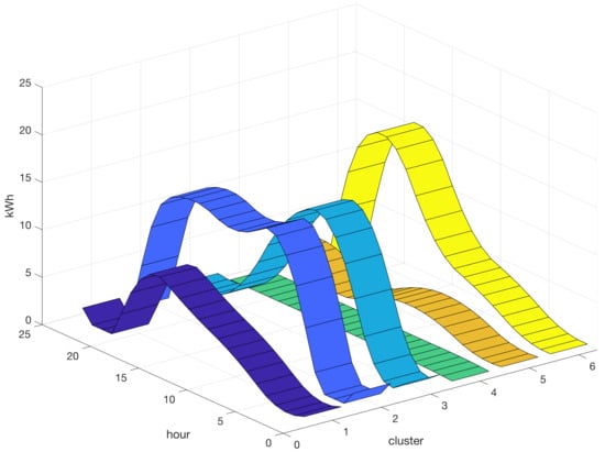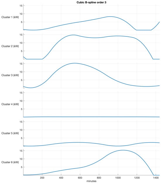 Analysis of these clusters revealed distinct shapes and corresponding load profiles. Six clusters were identified, with Clusters 1, 4, and 6 exhibiting low-load energy profiles and Clusters 2, 3, and 5 displaying high-load energy profiles. Notably, Cluster 2 demonstrated a high-load profile at an interval of approximately 16 h, whereas Clusters 3 and 6 revealed high-load profiles with a shorter duration. Cluster 3 grouped energy profiles with a high load during the first half of the day, whereas Cluster 6 grouped energy profiles with a high load during the second half of the day. These findings are consistent with those previously discussed for B-spline regression.