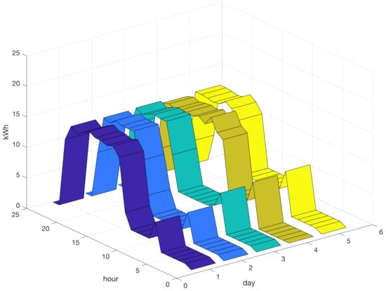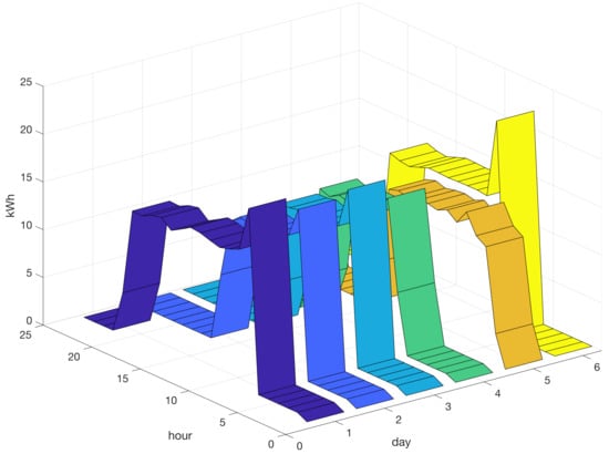 Figure 8 shows a collection of energy profiles classified as Cluster 2 (a high-load profile recurring every 16 h), whereas Figure 9 shows a group of energy profiles grouped as Cluster 3 (a high-load profile lasting for 7 h during the first half of the day). Figure 10 illustrates a set of energy profiles classified as Cluster 6 (a high-load profile lasting seven hours in the second half of the day).