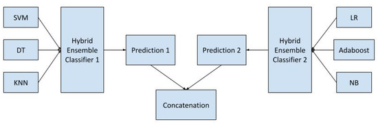 The predictions from both hybrid ensembles are then concatenated and used as input to a Voting Classifier. This final step aggregates the predictions from all base classifiers, employing a majority voting scheme to make the final prediction. The main reason behind this concatenated hybrid ensemble approach is to exploit the diversity of base classifiers, each with its strengths and weaknesses. By combining two hybrid ensembles, we aim to enhance the model’s overall predictive performance.
