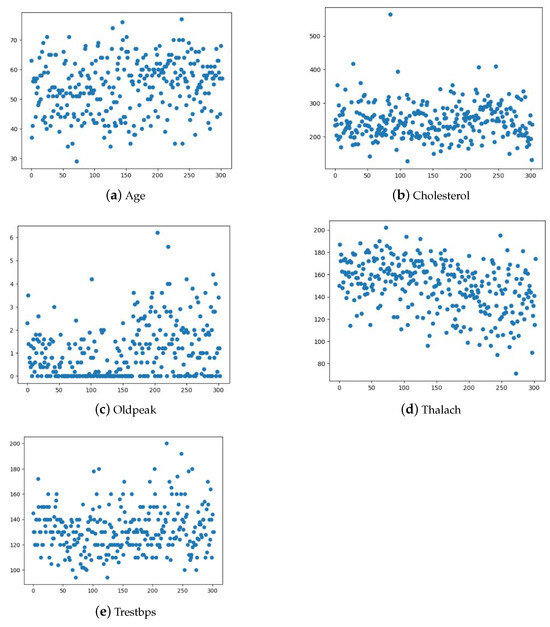 The distribution of continuous variables, including age, cholesterol, oldpeak, thalach, and trestbps, is visualized through the scatter plots in Figure 3. This figure helps us identify potential data patterns and outliers, which can influence the choice of appropriate modeling techniques and preprocessing steps.