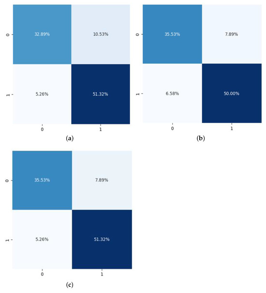 In the first phase of the experiment, the first ensemble classifier was built using Support Vector Machine, Decision Tree, and K-Nearest Neighbor as base classifiers. The confusion matrix generated by applying the first ensemble classifier is shown in Figure 5a. Subsequently, in the experiment, the second ensemble classifier was applied, and was constructed using Logistic Regression, Adaboost, and Naive Bayes as base classifiers. The generated confusion matrix is shown in Figure 5b. The confusion matrix of the final proposed classifier is presented in Figure 5c.
