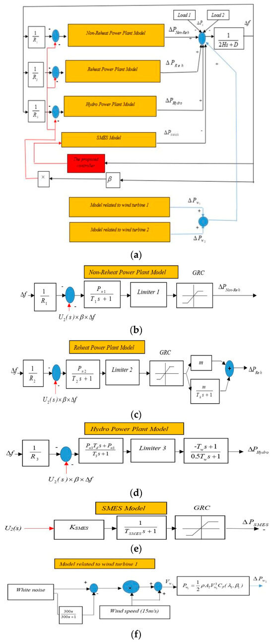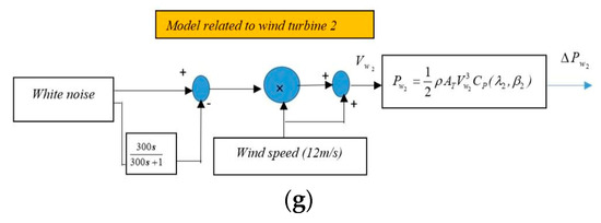(a) Dynamic model of the power system, taking into account the presence of the wind turbine. (b) Non-Reheat power plant model. (c) Reheat power plant model. (d) Hydro power plant model. (e) SMES model. (f) Model rated to wind turbine 1. (g) Model rated to wind turbine 2.