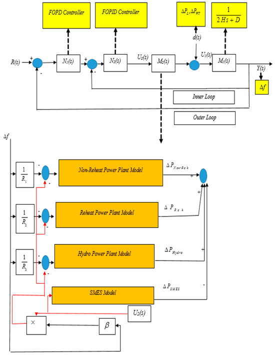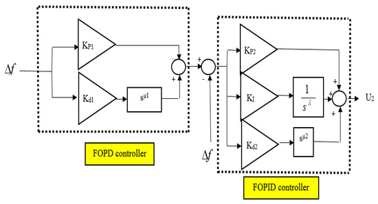 The FOPD–FOPID cascaded controller has been intricately designed to enhance the stability of frequency within power systems that incorporate wind turbines. Its primary objective is to minimize deviations in frequency caused by load disturbances, disruptions from wind turbines, and uncertainties in power system parameters. This elaborate controller consists of two components: the FOPD controller and the FOPID controller. The FOPD controller primarily determines the outcome, while the FOPID controller shapes and guides it by adjusting the reference signal. In this proposed control framework, the FOPD controller is referred to as the main, primary, or external controller, and the FOPID controller is referred to as the internal, secondary, or sub-controller. These components work synergistically, as depicted in Figure 3, to establish cohesive coordination between the LFC system and the SMES. Figure 3 illustrates the suggested setup of the cascaded controller, which facilitates the orchestration of the inner loop dynamics through Equation (3). Equation (3) succinctly represents the transfer function that exclusively encapsulates the inner loop dynamics, as demonstrated in Figure 3: