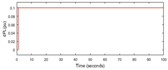 In this scenario, the power system being analyzed (Figure 2) experiences a disruption in its load with an amplitude of ΔPL = 0.1 pu at t = 1 s, as depicted in Figure 6. The fundamental parameters pertaining to the DOSA and FOPD–FOPID cascaded controller are presented in Table 2. Figure 7 illustrates the optimization process of FOPD–FOPID controller parameters using different algorithms, namely DOSA, MSA, PSO, ABC, and GTO. The objective function utilized is ISE. As demonstrated by Figure 7, it can be observed that the DOSA algorithm yields a swifter convergence rate than the others mentioned. In terms of ISE values obtained from the respective algorithms (DOSA: 6.8 × 10−6; GTO: 9 × 10−6; MSA: 9.1 × 10−6; ABC: 9.9 × 10−6; and PSO: 10 × 10−6), they are displayed in numeric format for easier comprehension. In Table 3, the values of optimized parameters of the FOPD–FOPID controller considering the ISE objective function for DOSA, GTO, MSA, ABC, and PSO algorithms are shown. According to Figure 7 and Table 3, the DOSA can be used to optimize the FOPD–FOPID controller parameters. In this scenario, load disruptions and wind turbine disruptions have been applied to the power system according to Figure 8. In Figure 9a–e, the FR of the power system using different control methods to load and wind turbine disruptions is shown. According to Figure 9a, the MFD and ST based on LFC and SMES based on the proposed controller (optimized FOPD–FOPID controller using the DOSA) is equal to 0.0009 Hz and 4.2 s, respectively. The MFD and ST based on controller 1 are equal to 0.0018 Hz and 5 s, respectively; the MFD and ST based on controller 2 are equal to 0.0173 Hz and 19 s, respectively; the MFD and ST based on controller 3 are equal to 0.021 Hz and 38 s, respectively; and the MFD and ST based on controller 4 are equal to 0.0476 Hz and 90 s, respectively (Figure 9b–e). Based on the outcomes of this particular scenario, it is evident that the proposed controller surpasses its counterparts in effectively mitigating power system deviations, and it has also reduced the ST of frequency deviations caused by disruptions on the power system.
