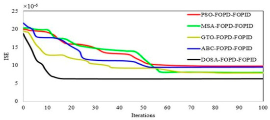 Convergence of DOSA, MSA, PSO, ABC, and GTO algorithms in optimizing FOPD–FOPID controller parameters.