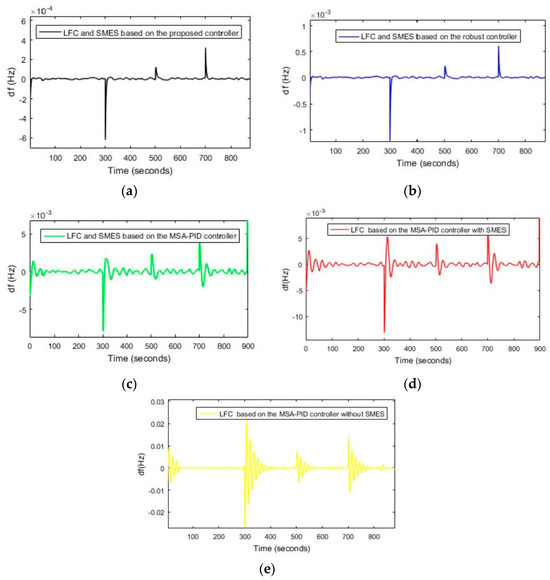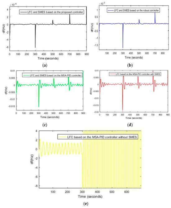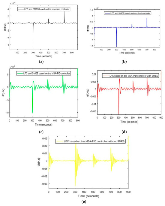 (a) The FR of the power system is based on the proposed controller, Scenario (1). (b) The FR of the power system using controller 1, Scenario (1). (c) The FR of the power system using controller 2, Scenario (1), (d) The FR of the power system using controller 3, Scenario (1). (e) The FR of the power system using LFC is based on controller 4, Scenario (1).