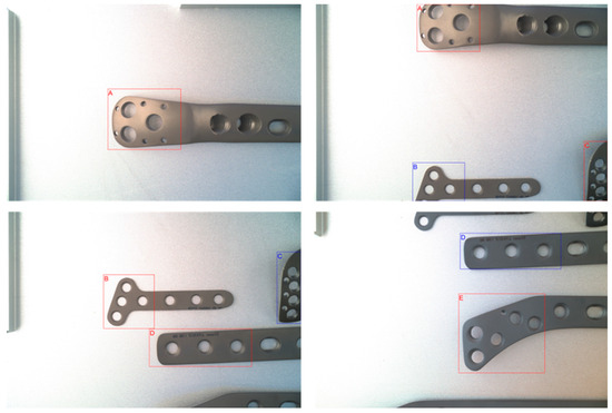Annotation examples of the dataset: selecting regions with significant feature differences for annotation, rather than the entire object. In the image, letters A, B, C, D, and E correspond to different models of bone plates, with each letter indicating a specific model distinguished by its unique features.