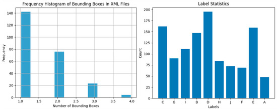 To evaluate the rationality of the dataset, we conducted a statistical analysis on the number of annotated bounding boxes in each image and the frequency of each category in the sampled dataset, as shown in Figure 6. Due to the large volume of the bone plates and the low camera shooting angle, the number of objects in each image is only between 1 and 4, with the majority being 1. There is also a significant difference in categories, with a roughly three-fold difference between the maximum and minimum values. This further increases the difficulty of model training and enhances the challenge of the task. To adapt to the characteristics of the dataset, we adjusted the number of pre-detection boxes in the improved DETR to 10 and made fine adjustments to the category loss calculation based on the probability of different categories appearing in the dataset. Specifically, we employed a weighted cross-entropy loss function. This loss function takes into account the probability distribution of each category in the dataset and assigns a weight to each category. The weights can reflect the degree of class imbalance.