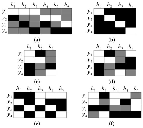 The general ECOC framework consists of two steps: coding and decoding. In the coding step, the ECOC coding matrix is first defined or learned from the training data, where each row of is the codeword of a class, each column corresponds to a binary classifier (dichotomizer), L is the length of the codewords, C is the number of classes, symbol ‘1’ indicates a positive class, ‘−1’ indicates a negative class, and ‘0’ indicates the class that can be neglected during training the binary classifiers. Subsequently, the binary classifiers (dichotomizers) are trained according to the partition of the classes in each column of . Figure 1 shows some coding matrices encoded with different coding strategies. The white grids are coded by 1, the dark grids are coded by −1, and the gray grids are coded by 0. In the decoding step, the test data are predicted based on an adopted decoding strategy.