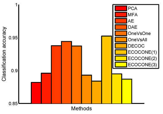 From Figure 3, we can observe that DeepECOCs with the ECOCONE (initializing by one-versus-one) coding strategy achieved the best result among other methods, including traditional feature learning models, existing deep learning methods and a single-layer ECOC framework. However, if we used other coding design strategies (except ECOCONE initialized by one-versus-one), the DeepECOCs did not outperform an autoencoder and denoising autoencoder.