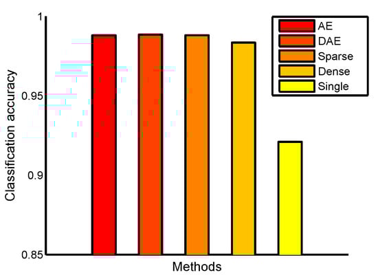 MNIST includes a training set of 60,000 samples and a test set of 10,000 samples with 784 dimensional features. We designed an architecture for the autoencoder, denoising autoencoder and DeepECOCs. The architecture is 784----10. Here, denotes the hidden layer learned from some coding strategies. We designed this architecture because we wanted to make the autoencoder and denoising autoencoder have the same structures as DeepECOCs. In order to make DeepECOCs adapt to this structure, we used the dense and sparse coding design methods that controlled the codeword length. The denoising rate and dropout rate were set to 0.1, the batch size was set to 100, the learning rate was set to 0.01, and the number of epochs was set to 80,000. Figure 5 shows the comparison results. We can observe that DeepECOCs achieve comparable results with the autoencoder and denoising autoencoder, but perform better than the single-layer ECOC framework.