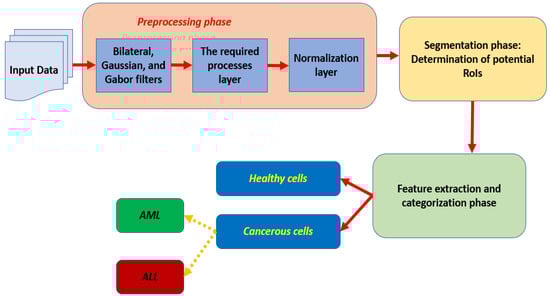 This section offers a complete description of the presented algorithm. The proposed model takes inputs of images, converts every image into grayscale, and performs some preprocessing to remove noise, enhance the pixels, rescale all images to a common size, and normalize each input. Normalization is applied to change pixel intensity and divide each pixel value by the allowed maximum value that a pixel can take. The system rescales each input to 600 × 600 pixels. The performed preprocessing processes are applied using some built-in functions. These functions include filters, such as Bilateral, Gaussian, and Gabor. In addition, morphological operations are deployed to support the presented framework in its segmentation stage. Then, the segmentation stage takes place to segment each input to outline potential Regions of Interest (RoIs). These regions are utilized to extract the needed characteristics for the categorization stage. The utilized segmentation stage is applied using the newly implemented model for this purpose based on U architecture. This architecture is a simple, popular architecture used in image segmentation; training a model is easy on this network, and preferable for applications that require less computational resources. In addition, UNET is composed of two components, which are a contracting path and an expansive path [30,31,32]. The contracting path is represented by the left-hand side and the expansive path is denoted by the right-hand side. In the contraction stage, the proposed approach reduces the spatial information and increases feature information [30,31,32]. The expansive pathway is responsible for combining the extracted features and the spatial information. Moreover, UNET architecture localizes and distinguishes RoIs by performing operations based on the pixel level to equalize the size of input and output. After that, the classification is performed using the UNET model to categorize the identified potential RoIs as either healthy or cancerous cells. The cancerous cells are further classified into two suitable types, which are ALL and AML as depicted in Figure 1. Unfortunately, the deployed datasets contain only these two types. Figure 1 illustrates a flowchart and block diagram of the proposed approach to discover and categorize leukemia using blood images. Some blood smear images can be blurry and contain undesirable noise, which could affect the segmentation process and lead to unneeded outcomes. Thus, these images should be clear; this is achieved using three built-in filters, which are Bilateral, Gaussian, and Gabor.