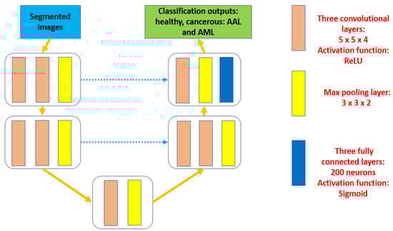 In Figure 3, the feature extraction and categorization operations are performed using the UNET structure. This structure includes three levels. Each level contains layers of convolutional, max-pooling, and fully connected. In addition, the ReLU activation function takes place at each level. The proposed approach categorizes results as healthy or cancerous cells. Cancerous cells are classified into two groups, which are ALL or AML. No public datasets that included all four types were found. In every convolutional block, a dedicated number of kernels is assigned to ensure that diverse features are achieved. The utilized number of kernels is 5 × 5 × 4. Three fully connected layers with 200 neurons in each are deployed. The last fully connected block includes three nodes to represent the total number of obtained findings by the proposed framework, which are healthy cells, ALL cells, and AML cells. Table 4 shows the applied configuration hyperparameters inside the feature extraction and classification stage.