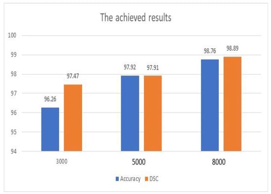 As shown in Table 5 and Table 6, the deployment of the optimizer tool had a significant role in the achieved results. The obtained results of the considered performance quantities were increased using the optimizer tool. Figure 4 illustrates the achieved outputs of accuracy and DSC when different numbers of iterations were applied, as shown in Table 4. In addition, these results were achieved with the use of the ADAM optimization tool. Both metrics improved significantly as the number of iterations increased. The enhancement of accuracy was 2.66%, while DSC improved by 1.43%. Furthermore, accuracy was improved when the scale of inputs was changed from 600 × 600 to 720 × 720 by approximately 8.21%. However, this improvement occurred with a penalty on the execution time.