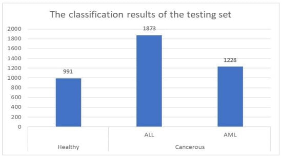 For the testing set, the proposed method was successfully identified and categorized 4092 images out of 4222, which represents approximately 97%. This set contained 1142 healthy cells and 3080 cancerous cells. These cells were 1731 ALL cells and 1349 AML cells. The presented system identified and categorized 991 healthy cells out of 1142 properly. Figure 5 shows the achieved results when the model was applied to the testing set.