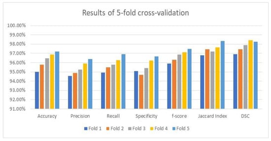 As stated earlier, the utilized datasets were divided into three dependent sets: training, validation, and testing. The testing set was evaluated using an average value on the five-fold cross-validation methodology to prove its accuracy and robustness. The attained average results of the considered performance parameters and their averages by the suggested framework are illustrated in Figure 9 using the applied optimizer. These results are exquisite and imply that the framework is reliable and trustworthy since accuracy, which is the main focused metric, increased after each fold as depicted in Figure 9. Figure 9 shows the visualization charts of the performance parameters using five-fold cross-validation.