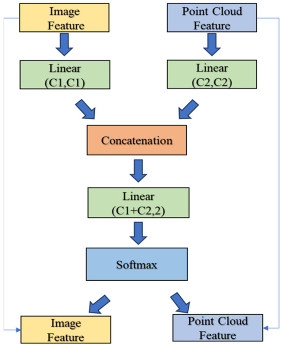For feature fusion problems, researchers often use feature addition or concatenation to design attention modules [7,27,28,29]. Since the importance of different features in the model often differs in different tasks, using the attention mechanism to complete the feature fusion process can make different features better adapted to the needs of the task. At the same time, because the attention mechanism has the characteristic of interpretability, it can help us analyze the necessity and function of different features in the application process so as to form a deeper understanding of the problem and make reasonable improvements and optimizations to the model. However, additive attention is more suitable for features with the same semantic information. In 3D object detection problems, point cloud features represent position information, and image features represent semantic features. The direct addition of the two features will cause the position information to blur the semantic information. Therefore, in this study, we designed a feature attention module, as shown in Figure 2, and conducted research using three different models. The module performs linear layer encoding on the original point cloud feature and image feature. After concatenating them together, an added feature dimension is encoded to two by the linear layer. Finally, the features are scaled with the result of the Softmax activation function. Thus, for each point cloud or pixel, we can obtain the weight of the point cloud and the weight of image. And, by weighing the pixel-by-pixel point cloud and image features of the research object, obtaining a sum for the point cloud and image features, and dividing them by the number of point clouds or the total number of pixels of the object, respectively, the feature weights of the two parts expressed in numerical form can be obtained. And, we obtain an average for all the scenes in the dataset. In this way, the fusion process of the two parts of the problem can be better analyzed and understood, and the model can be reasonably improved.