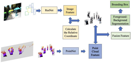 The F-PointNet model has a module called foreground–background segmentation, which classifies the point as either foreground or background. Then, the regression can be carried out based on the classification results. Considering that the role of image semantics may be more important in the foreground and background segmentation stage based on point clouds, this module was chosen for feature fusion. In the data preparation stage, the image within the bounding box and the corresponding coordinates of the point cloud projected to the image are saved in the model’s read-in file along with the 2D bounding box information. When the model is reading data, the image within the detection frame is scaled into an image block of a specified size and the absolute coordinates corresponding to the point cloud in the 2D bounding box are converted into relative coordinates within the bounding box. For the conversion of the coordinates, specifically, we first use the x-coordinate and y-coordinate of the pixel projected by the point cloud within the bounding box, subtract the x-coordinate of left edge and y-coordinate of upper edge of the bounding box, then measure the size of the bounding box, and then normalize the x-coordinate and y-coordinate to [−1, 1]. With the result we obtained in the first two steps, we finally scale the coordinate of each pixel within the bounding box to a new coordinate in the image block through interpolation. Thus, the relative coordinates of the point cloud in the bounding box are obtained. The corresponding pixels in the bounding box are sampled with the specified number of sampling points (such as 1024). During the detection process, PointNet [15] is used to extract features from point clouds, and ResNet [30] is used to extract features from image blocks. The image features corresponding to the point cloud are found through interpolation, and their features are spliced with the point cloud features to complete the fusion process.