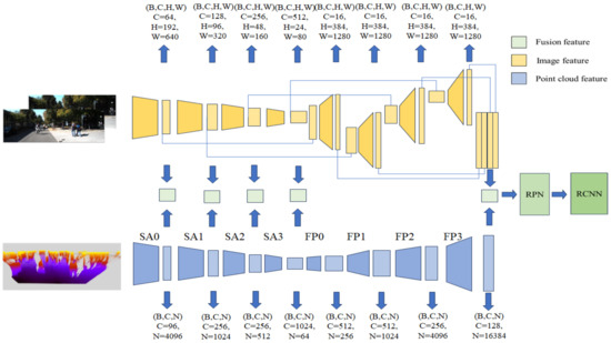 EPNet, proposed by Huang et al. [7], uses the image features and point cloud features to perform deep fusion. It is based on the Point R-CNN [26] detection model. The deep fusion method is shown in Figure 6. Four point set abstraction (SA) layers and four feature propagation (FP) layers are used to process the point cloud features. Convolution and deconvolution are used to process the image feature. Fusion is performed after each layer of SA and after the last layer of FP. The channel and size variation of the feature is shown in Figure 6. The feature fusion process of the EPNet model is carried out within the entire image, but it is designed for the fusion of the lidar point cloud and images. By projecting the lidar data back to the image, we obtain the corresponding pixel features by bilinear interpolation, and we fuse the image features with the point cloud point by point. The EPNet model fuses the image features in the form of additive attention. This article refers to the deep fusion method of the EPNet model and applies it to the problem of stereo 3D object detection, but we carried out the feature fusion process with our feature attention module, not with the additive attention.