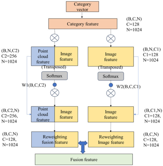 In this study, in the feature fusion process of the PL-FP (Pseudo-Lidar F-PointNet) model [5,6], we found that although the feature fusion method helped improve the detection performance, its segmentation accuracy in the foreground and background segmentation module decreased. This may occur because, for the original design, without the help of image features, the category feature was directly concatenated with the point cloud feature, but for the feature fusion process, we did not use category information and only used point clouds and image features. It is difficult to distinguish some categories from the used data in some circumstances, such as a pedestrian and cyclist, so the accuracy of this module may be reduced. Thus, we hope to try to explicitly apply the category information obtained in 2D detection to enhance the difference in model weights during the object detection of different categories. In the explicit use of category information in the original paper of F-PointNet [6], the category information is presented in the form of one-hot vectors and is spliced and fused with the extracted point cloud features using one-dimensional convolution during the foreground and background segmentation process. In our work, we encoded the one-hot category vector with a linear layer and repeated the feature vector according to the number of point clouds to form a feature with a shape of (B, C, N) (B represents the number of batches, C represents the feature dimension, and N represents the number of point clouds) where C is consistent with the image feature dimension C1. After the feature weight analysis process, taking into account the important relationship between the image features and the foreground area, we concatenated the image feature and point cloud feature, and the dot product attention was used for the image–point cloud fusion feature and the image feature. The detailed design of the reweighted module is shown in Figure 7. Compared with the one-hot category feature directly concatenated with the fusion feature, the accuracy of segmentation was improved.